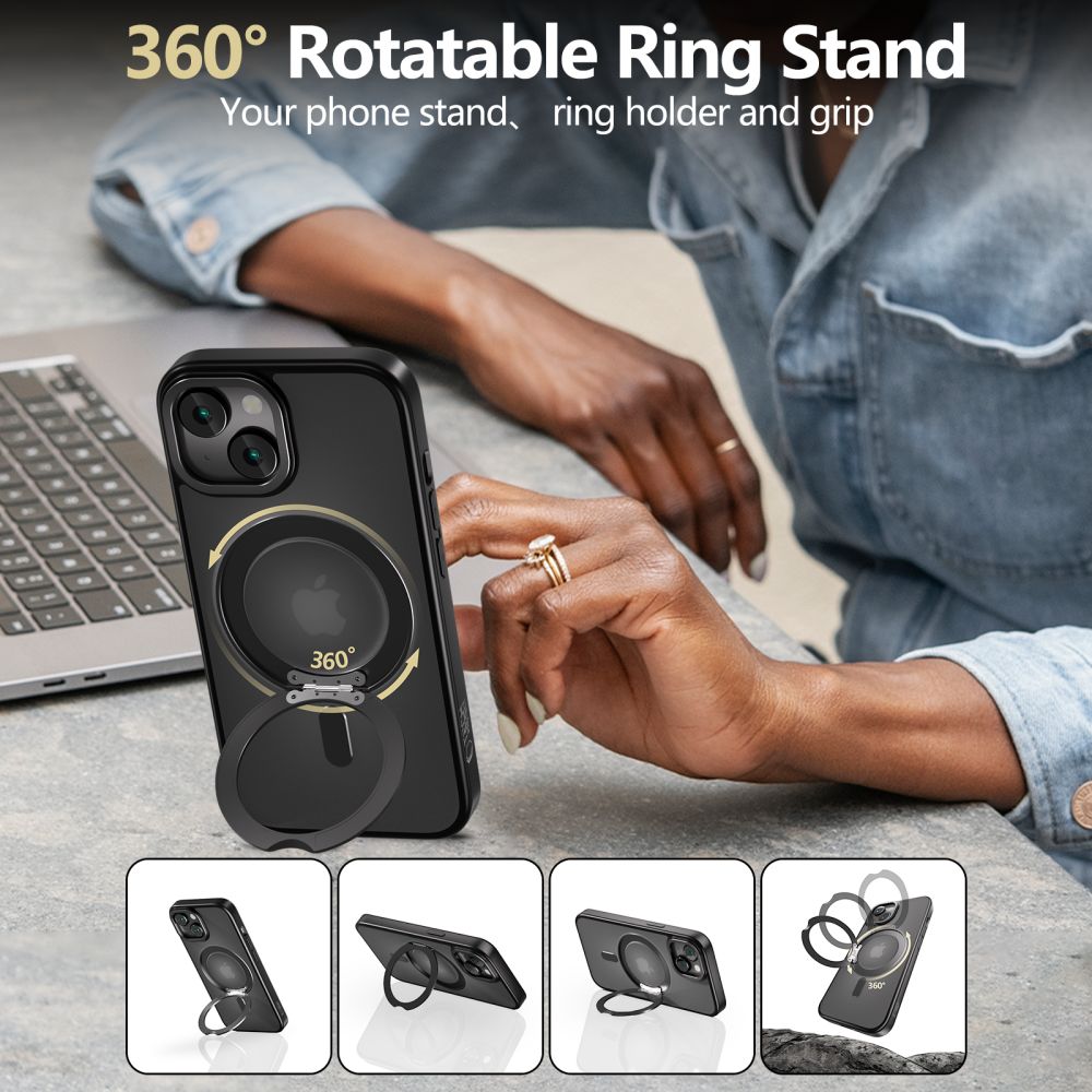 Kluczowym elementem etui jest ruchomy ring, który można obracać o 360 stopni, co umożliwia jego wykorzystanie na różne sposoby – jako podstawkę do wygodnego oglądania filmów, jako uchwyt na palec dla pewniejszego trzymania telefonu oraz jako element wspierający funkcję MagSafe. Dzięki właściwościom MagSafe, idealnie współpracuje z akcesoriami MagSafe, takimi jak ładowarki czy uchwyty magnetyczne.