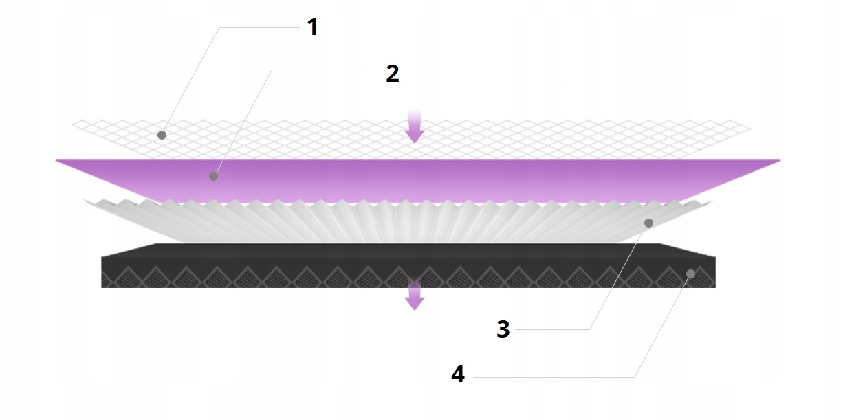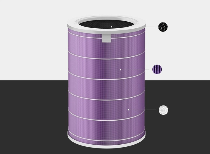 Filtr antybakteryjny Xiaomi Mi Air posiada aż 4 warstwy filtrujące, które oddziałują na różne typy zanieczyszczeń powietrza: