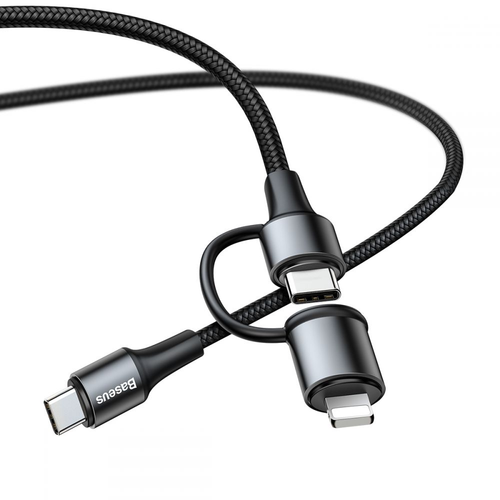 Wysoko wytrzymały kabel USB do USB-C posiadający złącze Type-C i nakładkę z końcówką Lightning, pozwalający na pełną synchronizację danych oraz ładowanie urządzeń w technologii Power Delivery 2.0 oraz Quick Charge 3.0.